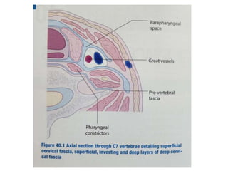 The document provides an overview of deep neck spaces and infections that can occur within these spaces. It discusses the layers of cervical fascia that divide the neck into various spaces. Some key spaces mentioned include the parapharyngeal, retropharyngeal, masticator, visceral, and carotid spaces. Common causes of deep neck space infections are discussed. Clinical features, investigations including imaging, and treatment approaches like antibiotics and surgical drainage are summarized. Maintaining a patent airway is emphasized as critical, and tracheostomy may be needed in some severe cases to protect the airway. Complications are also reviewed.