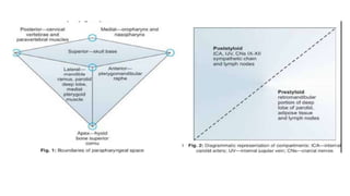 - The spaces include the masticator space containing the muscles of mastication, parotid space containing the parotid gland, and parapharyngeal space containing nerves and vessels.