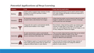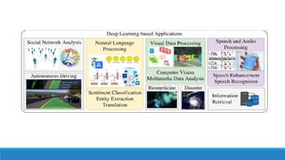 The document discusses deep neural networks (DNN) and deep learning. It explains that deep learning uses multiple layers to learn hierarchical representations from raw input data. Lower layers identify lower-level features while higher layers integrate these into more complex patterns. Deep learning models are trained on large datasets by adjusting weights to minimize error. Applications discussed include image recognition, natural language processing, drug discovery, and analyzing satellite imagery. Both advantages like state-of-the-art performance and drawbacks like high computational costs are outlined.