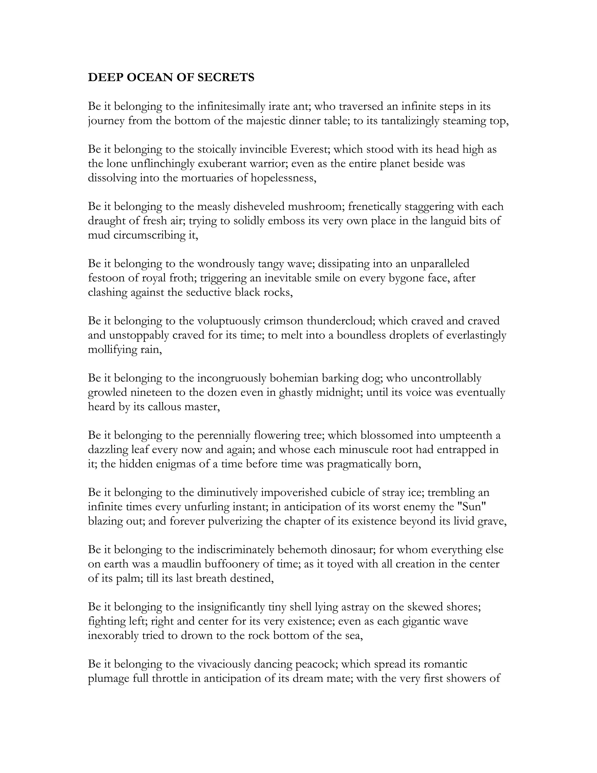This document discusses how everything in the world, no matter how large or small, from ants to mountains to trees, all have deep secrets within them. It describes the internal experiences and hidden mysteries of various living and non-living things on Earth, from dinosaurs and peacocks to blades of grass and grains of dust, emphasizing that everything contains profound secrets within.