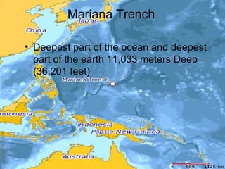 The document discusses the extreme environment of the deep ocean. It notes that the Mariana Trench is the deepest part of the ocean at 11,033 meters deep. It also discusses how the high water pressure, low temperatures, and unique gas levels can negatively impact human respiratory, muscular, and nervous systems if divers go too deep without proper equipment. Proper scuba gear, wet suits, oxygen tanks and deep sea submarines are needed to allow humans to explore depths beyond what the naked body can withstand.