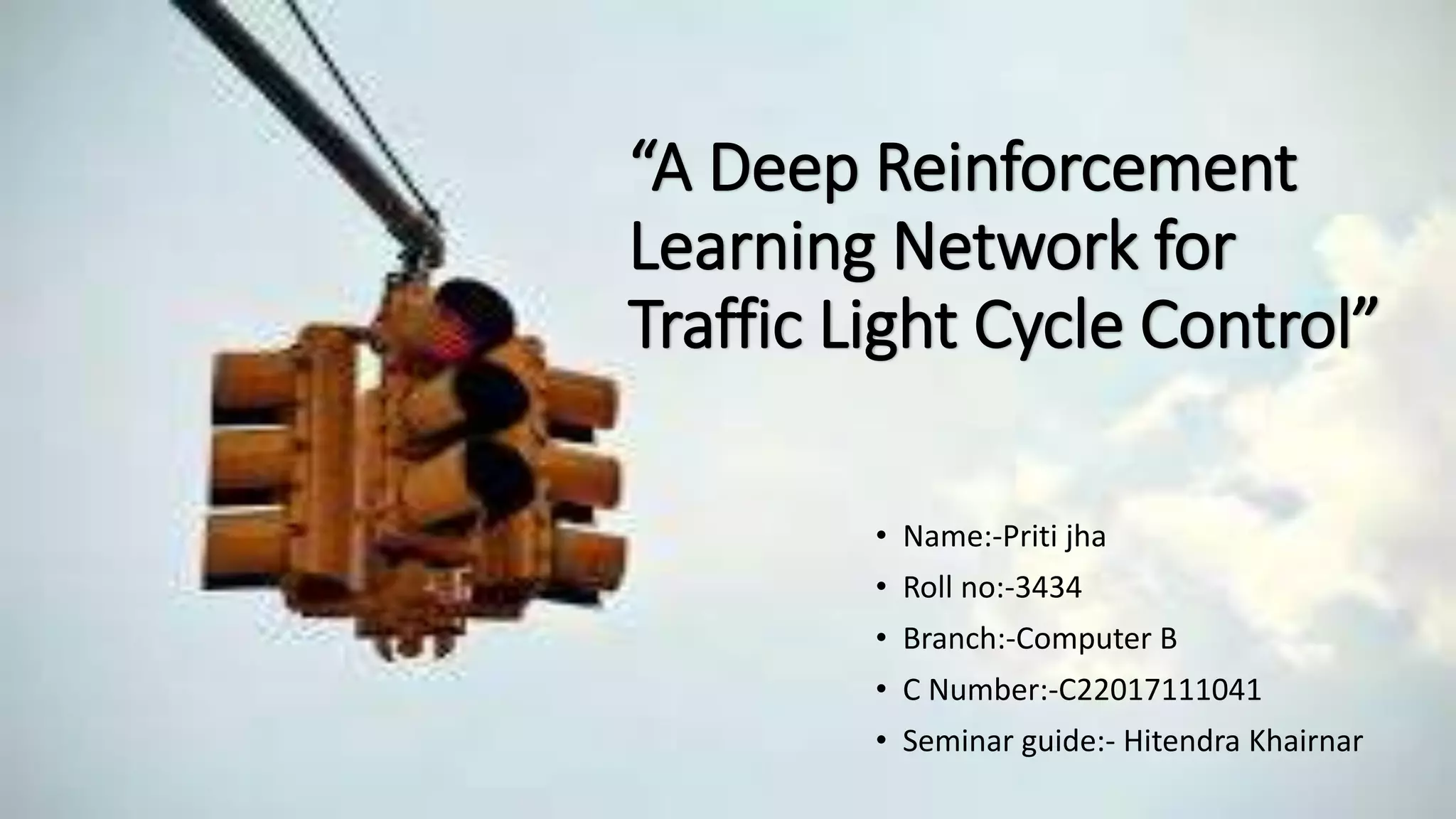 This document summarizes a student's seminar presentation on using deep reinforcement learning for intelligent traffic light control. It notes that India loses $22 billion annually to traffic congestion, which causes economic losses and increased accidents. As populations grow, transportation demands increase traffic issues. The student proposes using deep reinforcement learning to dynamically adjust traffic light durations based on real-time road conditions from cameras, with the goal of minimizing wait times at intersections. The model would use number of cars at each direction as the state, light duration changes as actions, and cars passing per cars waiting as the reward to optimize via Q-learning.