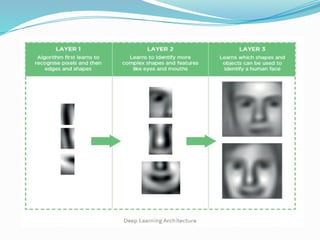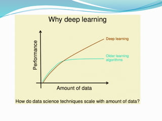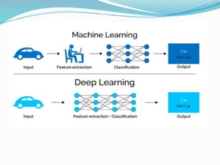 The document provides an overview of deep learning, outlining its benefits, such as automatic feature extraction and scalability, alongside its drawbacks, including the need for large datasets and high computational costs. It differentiates deep learning from traditional machine learning, emphasizing its end-to-end problem-solving approach and potential applications in various fields, such as computer vision and robotics. Additionally, it discusses the types of neural networks, like convolutional and recurrent networks, and introduces reinforcement learning as a method for training AI systems.