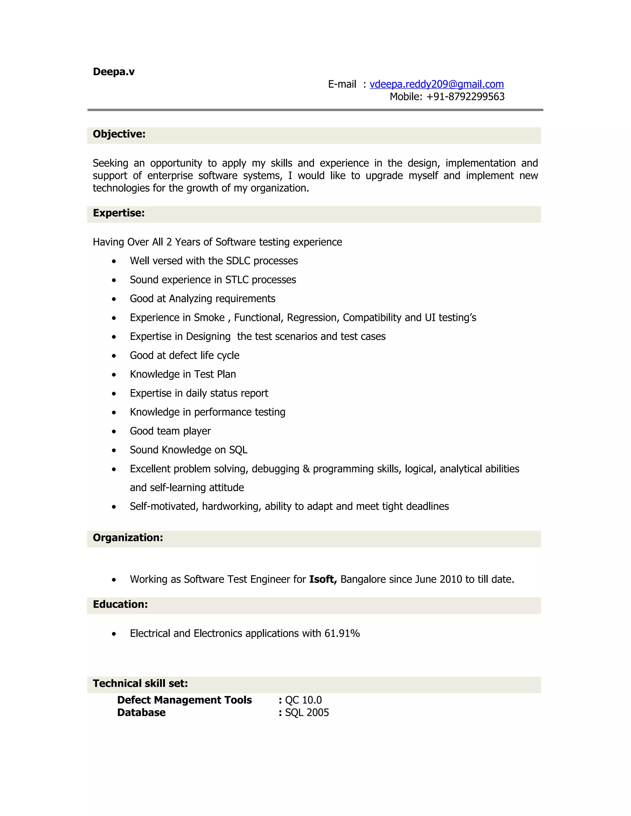The document provides a summary of Deepa V's skills and experience. It includes her contact information, 2-year experience in software testing, expertise in various testing techniques and processes, and education in electrical and electronics applications. It also summarizes two projects she was involved in - one for a banking client where she tested loan processes, and another for an insurance client where she tested a health insurance module. Her roles included requirements analysis, test case design, execution and defect reporting.