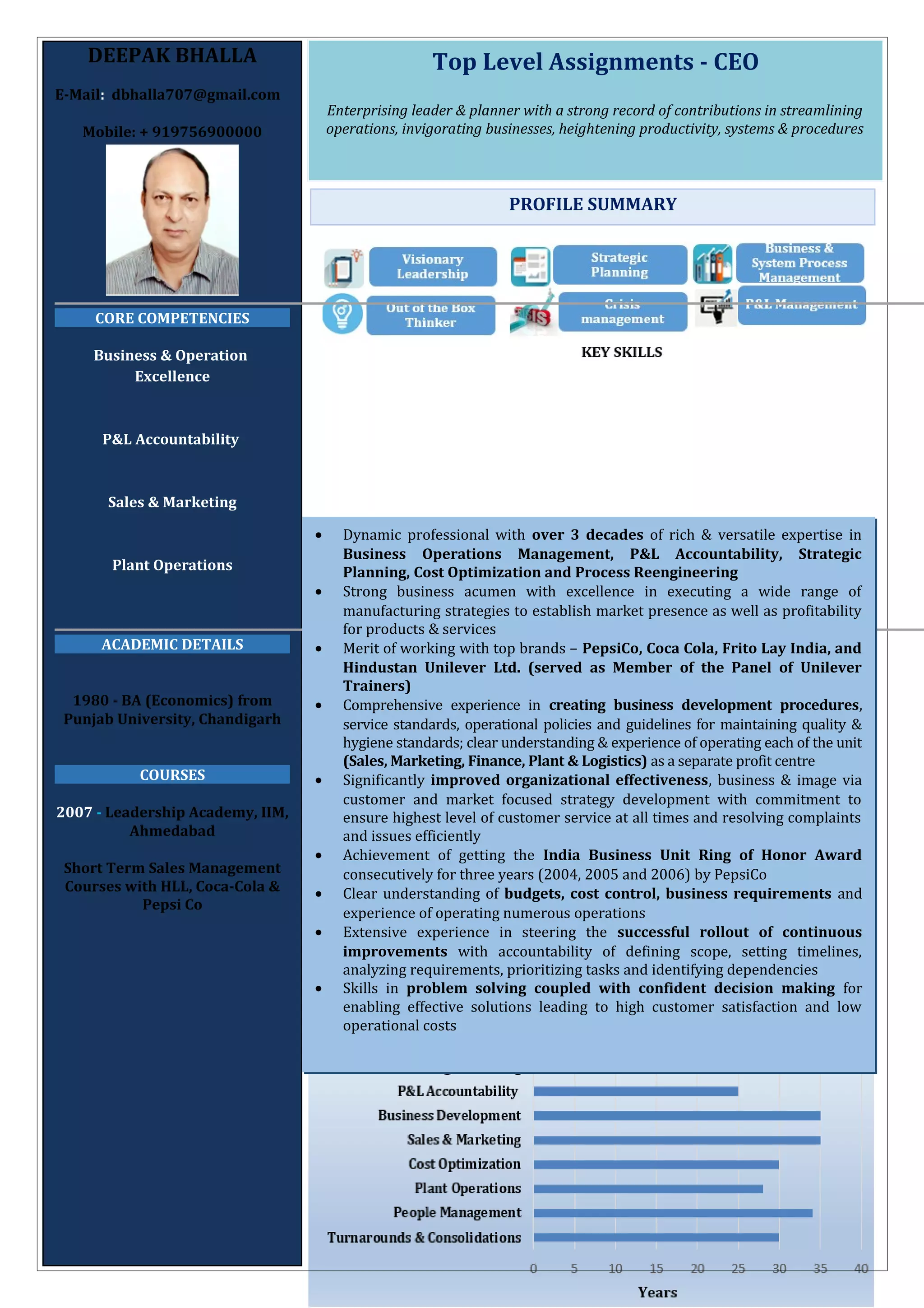 Deepak Bhalla is an accomplished business leader with over three decades of experience in operations management, sales, and marketing, having held various high-level positions at major brands like PepsiCo, Coca-Cola, and Hindustan Unilever. He currently serves as CEO of Varun Beverages in Mozambique, where he focuses on sales, marketing strategies, and operational excellence. His achievements include significant market share growth, implementation of continuous improvement practices, and recognition for exceptional performance in the beverage industry.