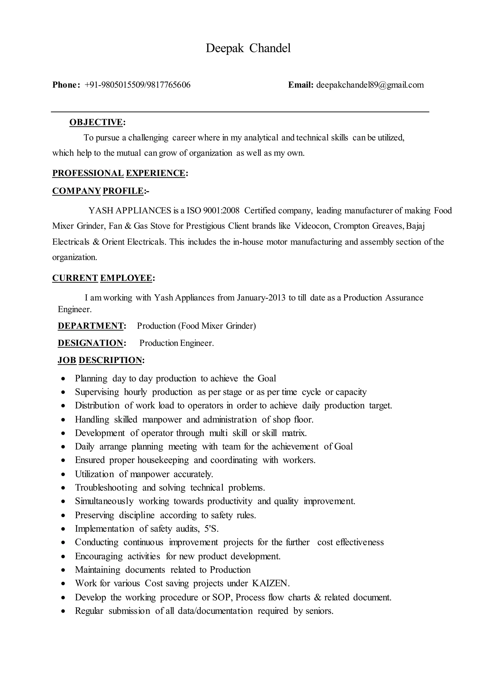 Deepak Chandel is seeking a challenging career where he can utilize his analytical and technical skills to help a company grow. He has worked as a Production Engineer at Yash Appliances since 2013. In this role, he is responsible for planning daily production, supervising workers, ensuring quality standards are met, and implementing process improvements. Deepak has a diploma in electronics and communication engineering and experience in production assurance, quality control, and new product development for appliances.