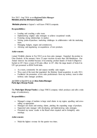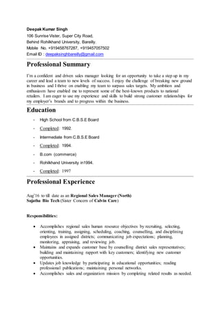 Deepak Kumar Singh is a Regional Sales Manager with over 20 years of experience in sales management. He is currently the Regional Sales Manager for North India at Sujatha Bio Tech, where he leads a team of 20 sales officers. Previously, he held sales management roles at various FMCG companies such as Wellable Pharma, Parle Agro Shurya Foods, and Doctor Morpen Ltd. He has a track record of consistently meeting and exceeding sales targets through effective sales strategies and strong customer relationships.