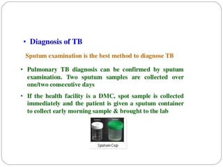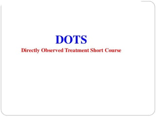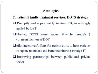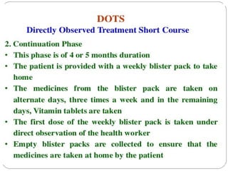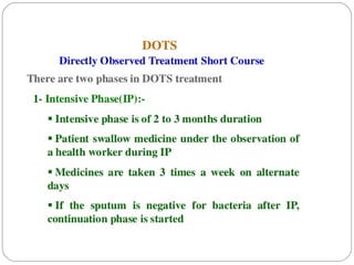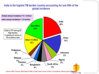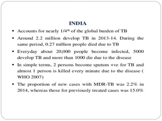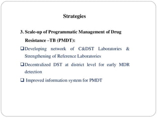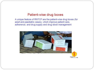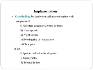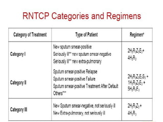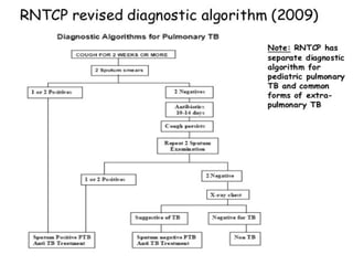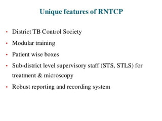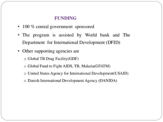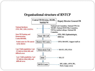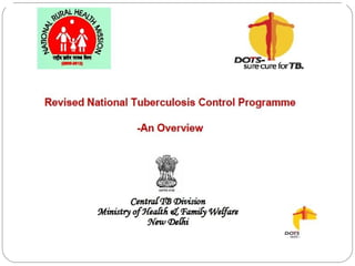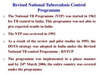 This document outlines the Revised National Tuberculosis Control Programme (RNTCP) in India. It summarizes that tuberculosis poses a major public health burden in India, accounting for 1/3rd of global cases. The National Tuberculosis Control Programme started in 1962, but failed due to low treatment completion rates and organizational issues. RNTCP was launched in 1997 with DOTS strategy, which involves directly observed treatment, short-course. RNTCP aims to reduce morbidity, mortality, and transmission of TB in India through early case detection and standardized treatment. It utilizes a decentralized organizational structure and relies on community health workers to observe treatment. If fully implemented, RNTCP aims to achieve global targets for TB control by improving cure rates and case