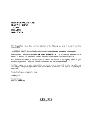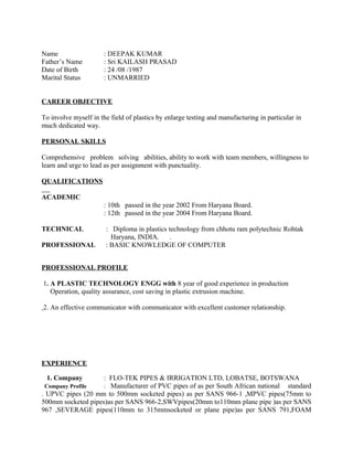 Deepak Kumar is seeking a job relevant to his qualifications and experience in plastics production and quality management. He has 8 years of experience as a Production Manager and Quality Engineer for companies that manufacture plastic pipes. Deepak has a diploma in Plastic Technology and is currently working as a Production Manager for a company that manufactures PVC and HDPE pipes in Botswana. He is looking to showcase his skills and abilities for a prestigious organization.
