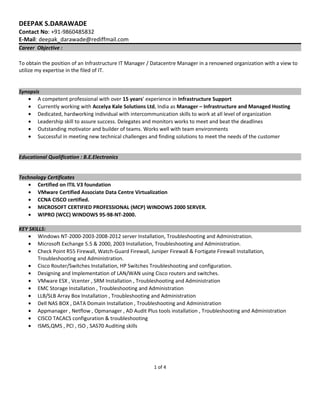 Deepak Darawade has over 15 years of experience in infrastructure support and datacenter management. He currently works as the Manager of Infrastructure and Managed Hosting at Accelya Kale Solutions, where he oversees the IT infrastructure, 24/7 support operations, and ensures service delivery standards are met. He has extensive expertise in areas such as Windows server administration, firewall configuration, storage installation, and virtualization. Darawade has a history of achievements including several awards for his work at Accelya Kale Solutions.
