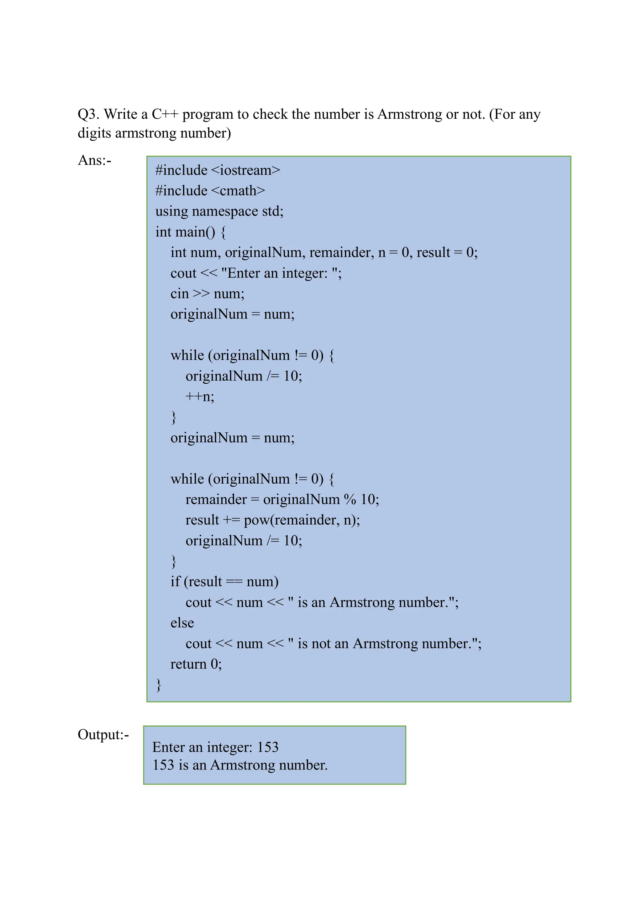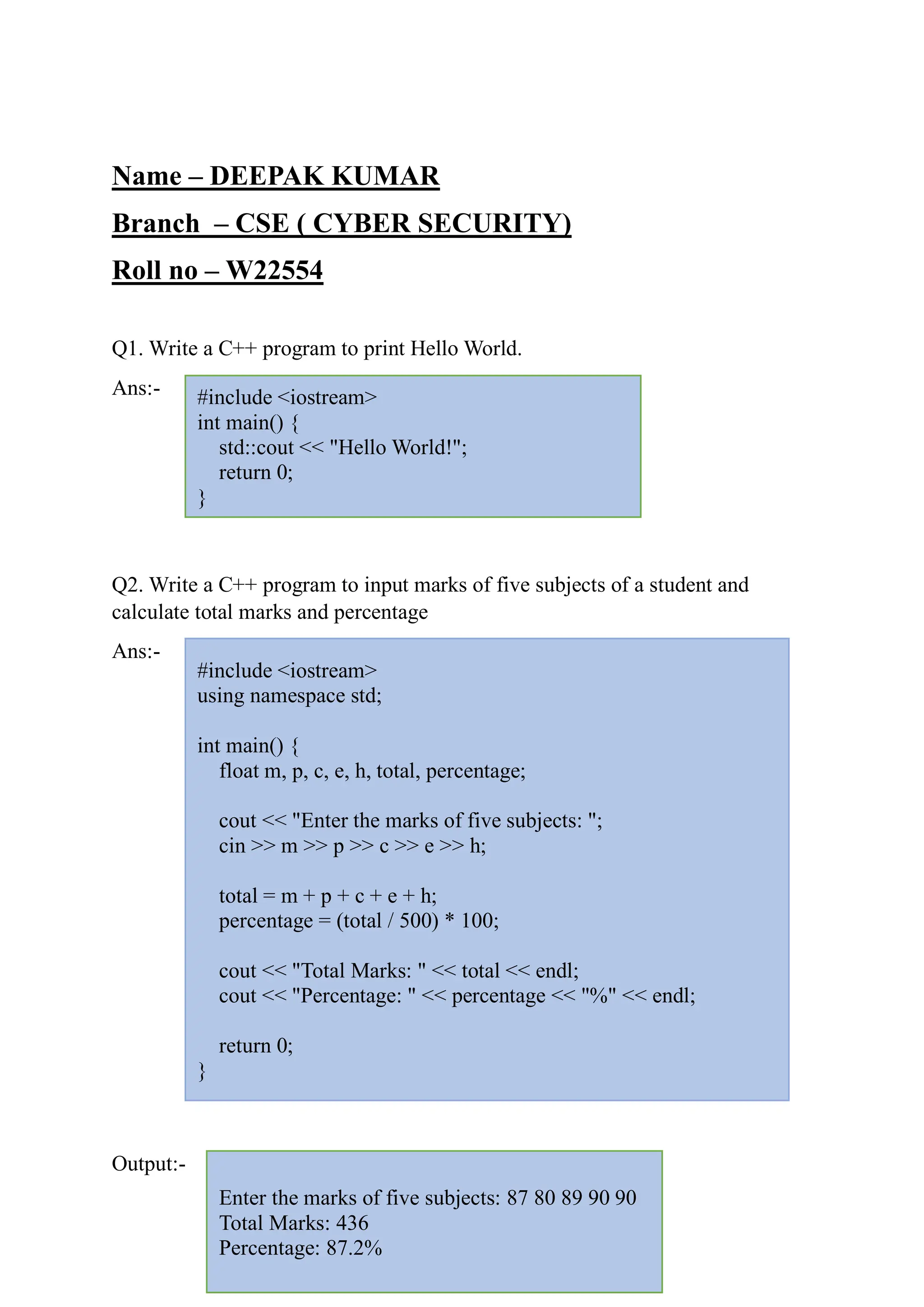 The document contains a student's C++ programming assignments, including code for printing 'Hello World', calculating total marks and percentage, checking for Armstrong numbers, and discussing the basic structure of C++ programs and principles of object-oriented programming (OOP). It explains key components of a C++ program such as header files, the main function, and various types of tokens in C++. Additionally, it covers concepts like encapsulation, inheritance, polymorphism, and abstraction in OOP.