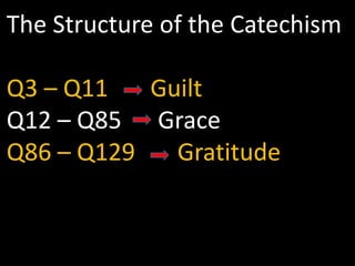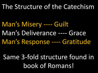 The catechism outlines the essential Christian message in three parts: man's misery (guilt), man's deliverance (grace), and man's response (gratitude). It teaches that Jesus is our faithful Savior, who fully redeemed us through his blood and also preserves us as his own. Our only comfort in life and death is belonging to Christ, who saves and keeps us for eternity.