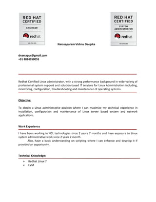 - Narasapuram Vishnu Deepika has over 2 years of experience in Linux administration and is seeking a Linux administrator position.