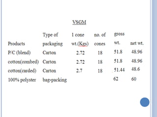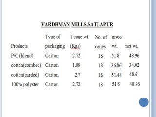 Vardhman Textiles produces yarns that are packaged for domestic, export, and in-house use. The researcher conducted a study to assess Vardhman's yarn packaging and identify ways to standardize packaging across product lines. Dealers indicated that product protection, labeling, and transport facilities were most important. The researcher suggests standardizing packaging specifications and using returnable packaging systems to reduce costs and environmental impact.