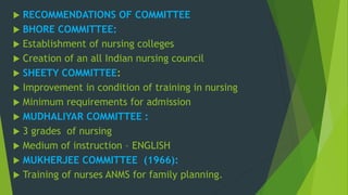 This document discusses the history and development of nursing education in India from the post-independence period to the present. It outlines several committees that made recommendations to improve nursing education and establish standards. It also describes the various levels of nursing education programs that now exist in India, from auxiliary nurse midwife training to PhD programs, as well as continuing education opportunities. Career opportunities for nurses have expanded beyond hospital settings to include community health, education, research, and private sector roles.