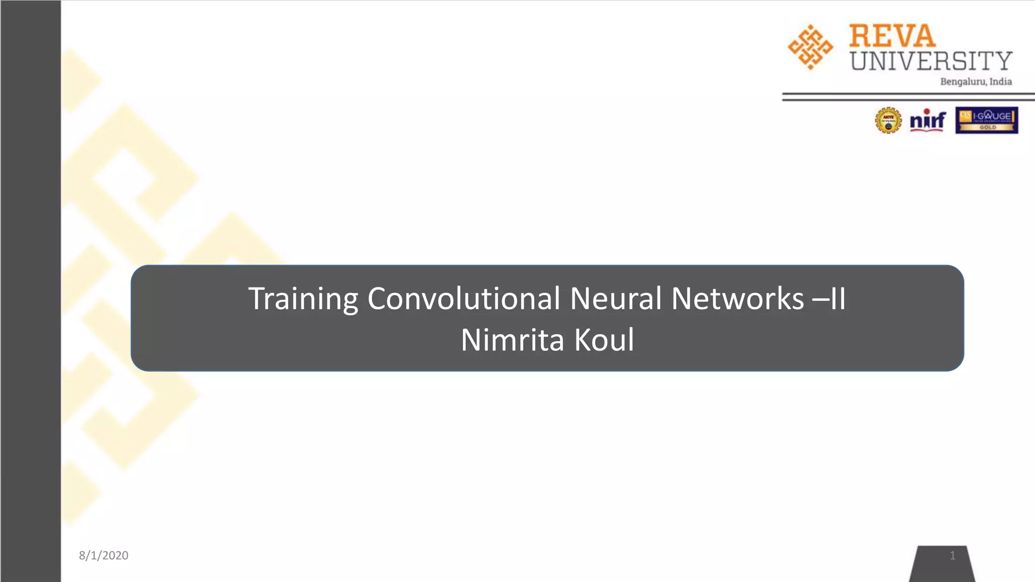 This document provides an outline and overview of training convolutional neural networks. It discusses update rules like stochastic gradient descent, momentum, and Adam. It also covers techniques like data augmentation, transfer learning, and monitoring the training process. The goal of training a CNN is to optimize its weights and parameters to correctly classify images from the training set by minimizing output error through backpropagation and updating weights.