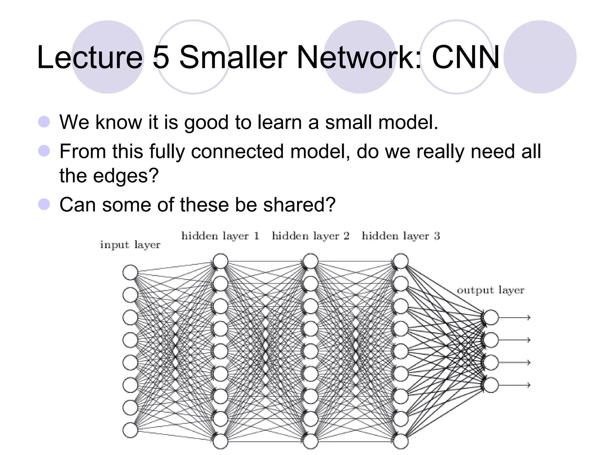 The document describes the architecture of convolutional neural networks (CNNs). It explains that CNNs help reduce the number of parameters in a neural network by sharing weights across filters and using fewer connections compared to fully connected networks. It also discusses how CNNs apply filters in a convolutional manner to detect patterns in local regions of input data, and then use max pooling to progressively reduce the spatial size of representations.