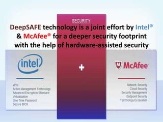 Deepsafe technology, a collaboration between Intel and McAfee, enhances security by leveraging hardware-assisted capabilities to monitor kernel-level threats beyond the operating system. It focuses on detecting elusive threats like rootkits and advanced persistent threats (APTs) at system boot-up, enabling real-time protection. This innovative approach aims to provide a deeper security footprint that traditional solutions cannot achieve.