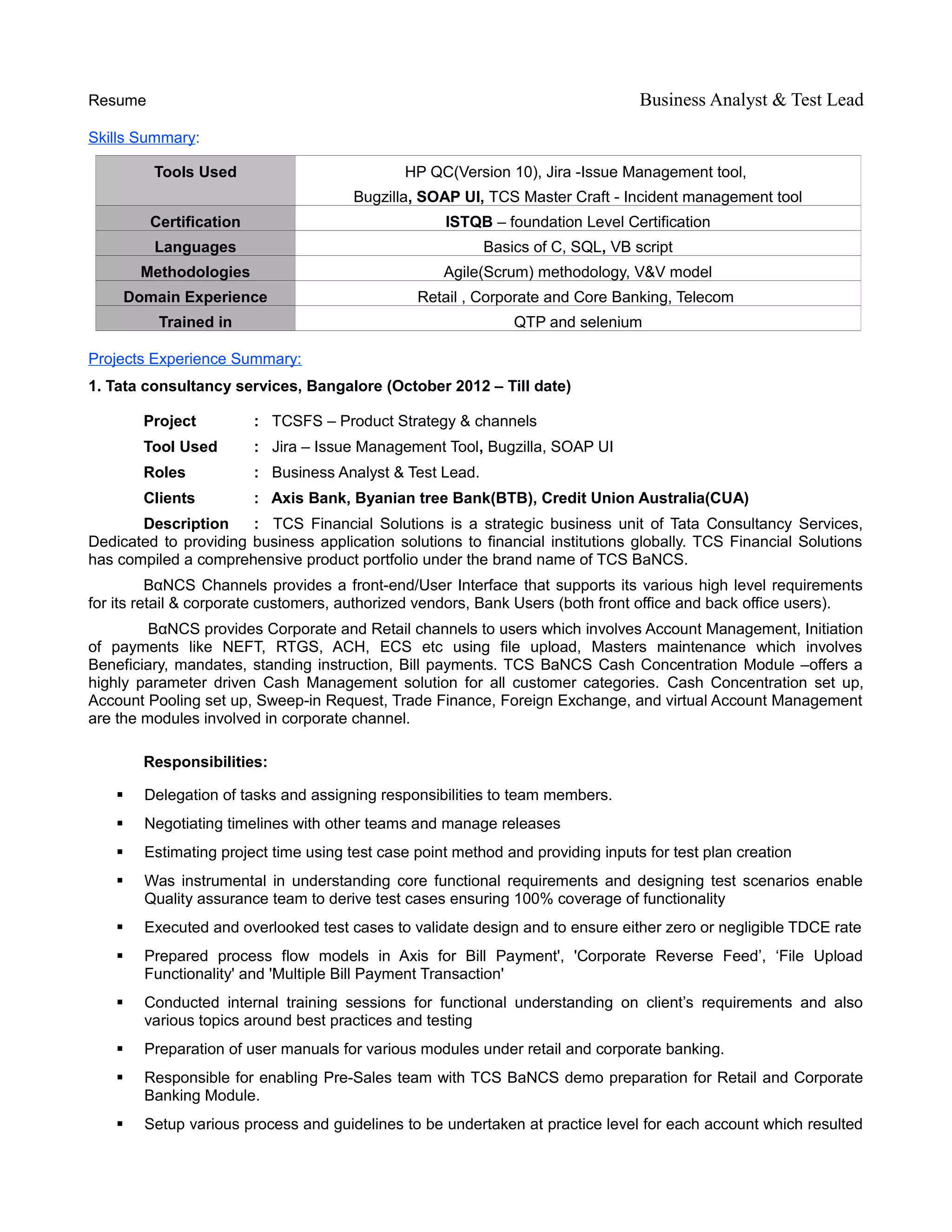 Deepthi DS has over 5 years of experience as a Business Analyst and Test Lead. She has worked on projects in retail banking, corporate banking, and telecommunications. As a Business Analyst, she gathered requirements, created documentation, and demonstrated products to stakeholders. As a Test Lead, she developed test plans and cases, executed testing, and ensured quality standards were met. She is proficient in tools like HP QC, Jira, and SOAP UI and has experience in agile methodologies.