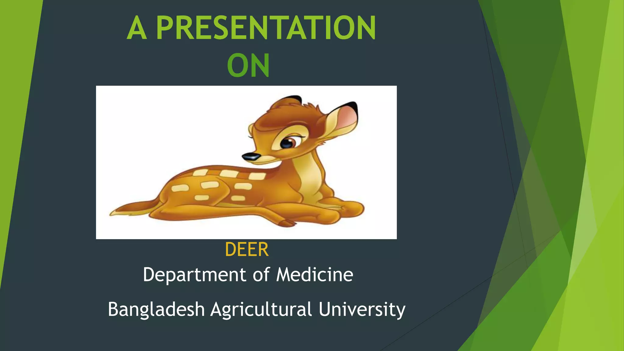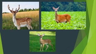 This presentation provides information on deer. It discusses that deer are even-toed ungulate mammals in the family cervidae. There are about 60 species of deer, and six live in the British isles. Only male deer have antlers, which are deciduous and shed annually. Deer behavior includes not making nests and finding safe places to rest. They eat grasses, plants and weeds. The presentation also outlines deer taxonomy, characteristics, reproduction, diseases, economic importance and drugs used for treatment.