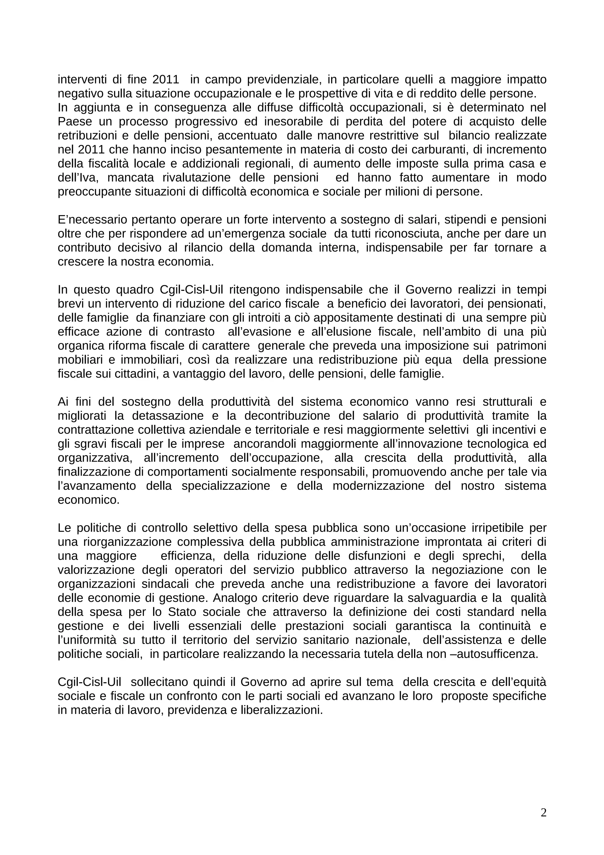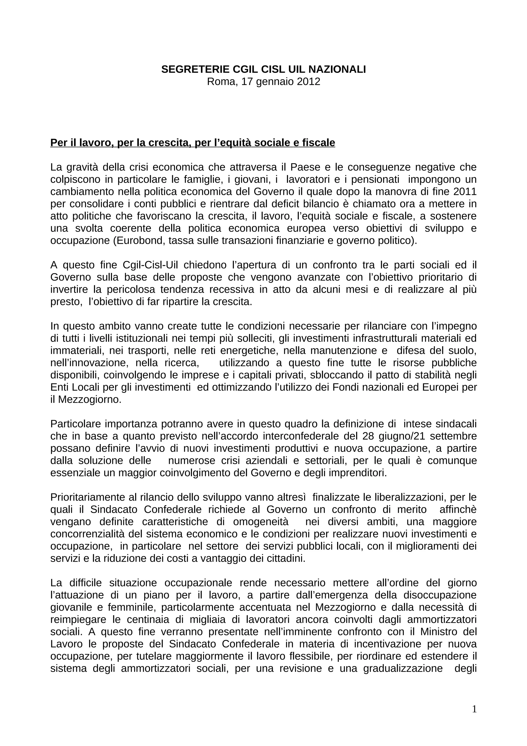 Il documento esprime preoccupazioni riguardo alla grave crisi economica in corso e propone l'adozione di politiche economiche che promuovano la crescita, l'occupazione e l'equità sociale e fiscale. CGIL, CISL e UIL sollecitano un confronto tra le parti sociali e il governo, con l'obiettivo di rilanciare investimenti e sostenere i lavoratori, specialmente in tempi di disoccupazione, attraverso un ripristino delle tutele e un riordino degli ammortizzatori sociali. Infine, si sottolinea l'importanza di politiche fiscali più eque e della revisione delle recenti misure previdenziali, che hanno avuto un impatto negativo sui diritti dei lavoratori e dei pensionati.