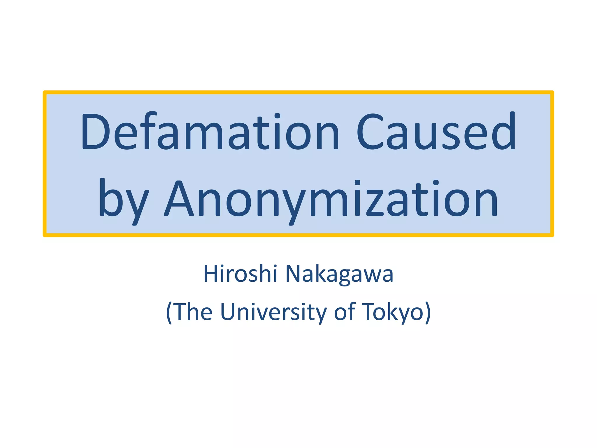 The document discusses the implications of k-anonymization in relation to defamation, particularly how it can harm individuals, such as job candidates, by linking them to negative reputations based on their group associations. It outlines a case study illustrating how a candidate's chances of employment can be affected if he is anonymized in a group containing individuals with undesirable backgrounds. The proposed solution is to improve k-anonymization algorithms to minimize the presence of undesirable individuals in groups while balancing the accuracy of the anonymized data.