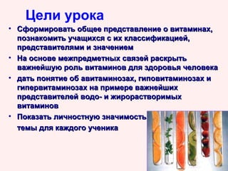 Документ представляет собой учебный материал о витаминах, их классификации, значении для здоровья человека и последствиях авитаминозов. В нем охвачены различные витамины, их источники и суточные потребности, а также советы по хранению и приготовлению пищи для сохранения витаминов. Также описаны функции витаминов и их влияние на организм, включая предупреждение о возможном гипервитаминозе.