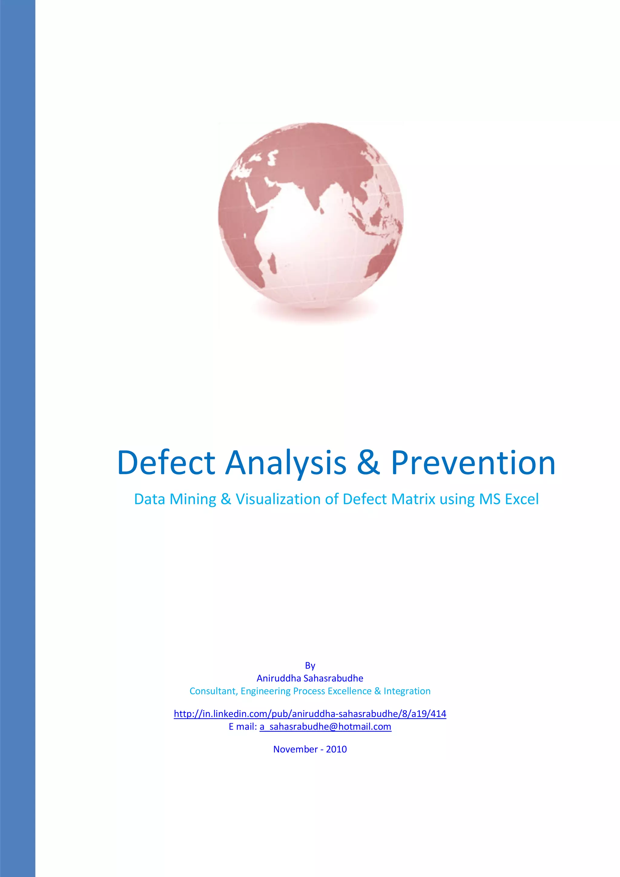 This document analyzes defect data from a pilot engineering project outsourced to an engineering service provider (ESP) to identify opportunities for improvement. The outsourcing organization found 427 defects in the pilot job. The ESP analyzed the defect matrix using Excel to determine: