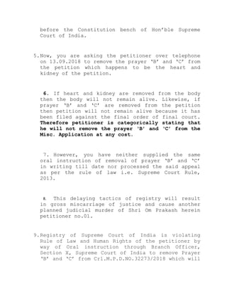 The petitioner filed a misc. application that was objected to by the Branch Officer for including improper prayers B and C. The petitioner then redrafted those prayers and refiled the application. However, the Branch Officer is now instructing the petitioner over the phone to remove those key prayers from the application. The petitioner refuses to do so as it would invalidate the application. The petitioner questions why the application has not been properly processed or listed for hearing according to the rules.