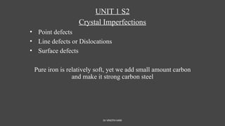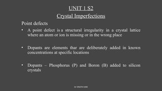 The document discusses crystal imperfections, categorizing them into point defects, line defects (dislocations), and surface defects. Point defects include vacancies, interstitial atoms, and substitutional defects, which affect the structural integrity of crystals, while dislocations are irregularities in atomic arrangement. Surface defects involve boundaries that separate regions within a material, such as grain boundaries and stacking faults.