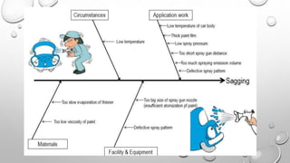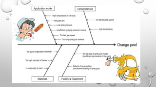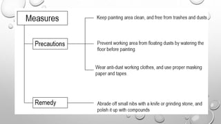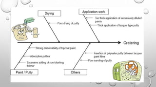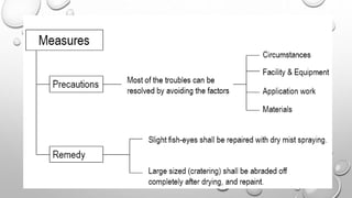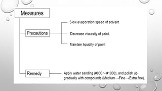This document discusses common paint defects including cratering, dust, orange peel, sagging, and poor opacity. Cratering and dust refer to popping and an uneven surface like orange peel. Sagging is when the paint film becomes too thick in parts and sags. Poor opacity is when the undercoat color shows through due to poor pigmentation or insufficient paint thickness.