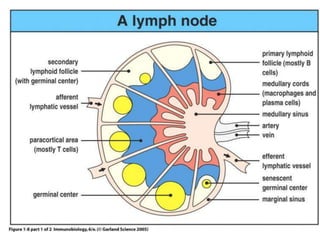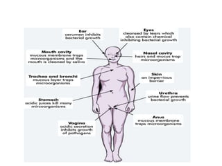 The document summarizes the body's three lines of defense against pathogens. The first line of defense consists of physical and chemical barriers like the skin, mucus, and sweat. The second line of defense involves defensive cells and proteins that attack pathogens that breach the first line, such as mast cells, neutrophils, and the complement system. The third line of defense comprises lymphoid cells that develop in primary organs like the bone marrow and thymus and secondary organs including the spleen, lymph nodes, and MALT tissues. Together, these layered defenses protect the body from infection.
