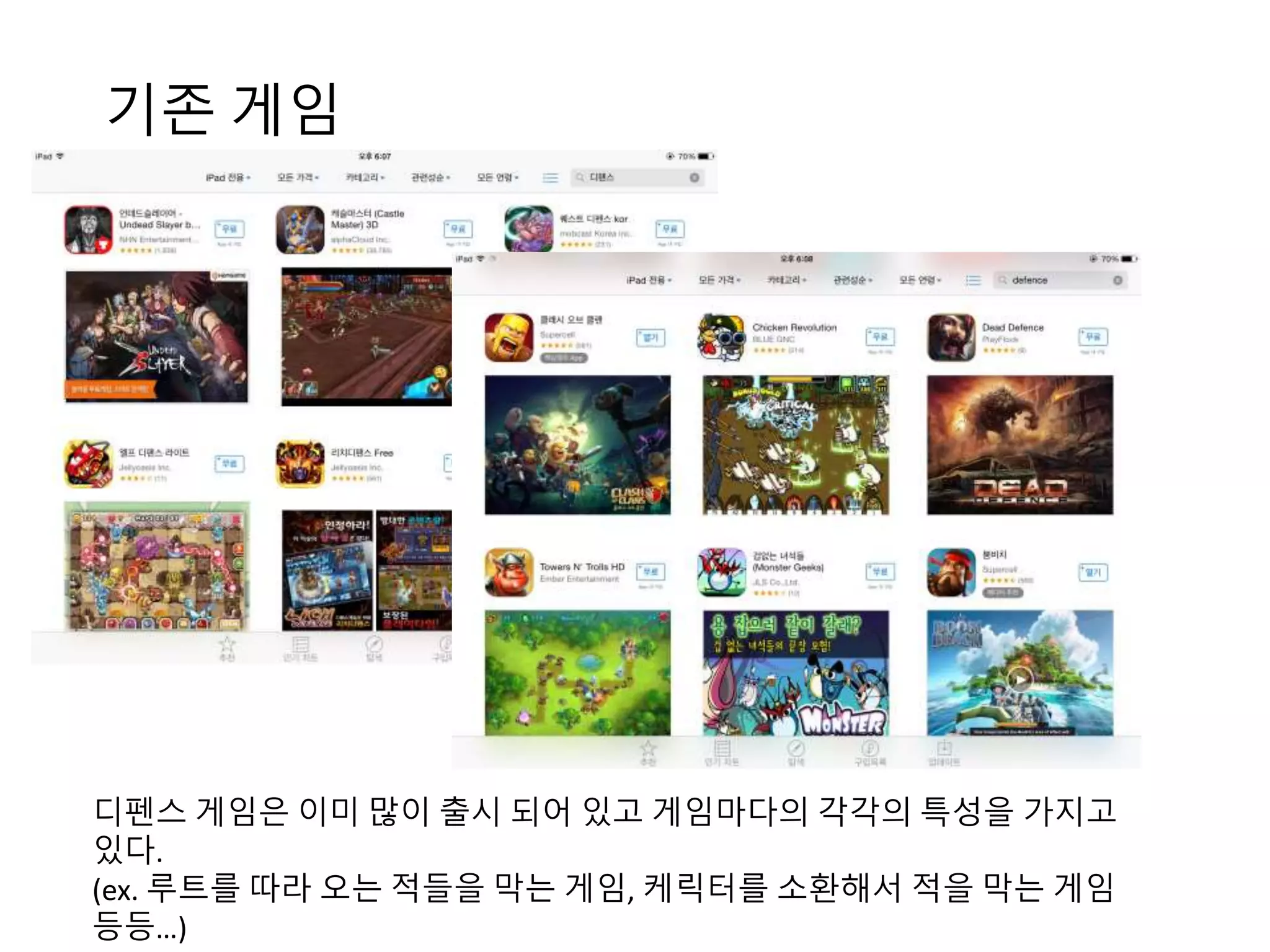디펜스게임은 이미 많이 출시 되어 있고 게임마다의 각각의 특성을 가지고