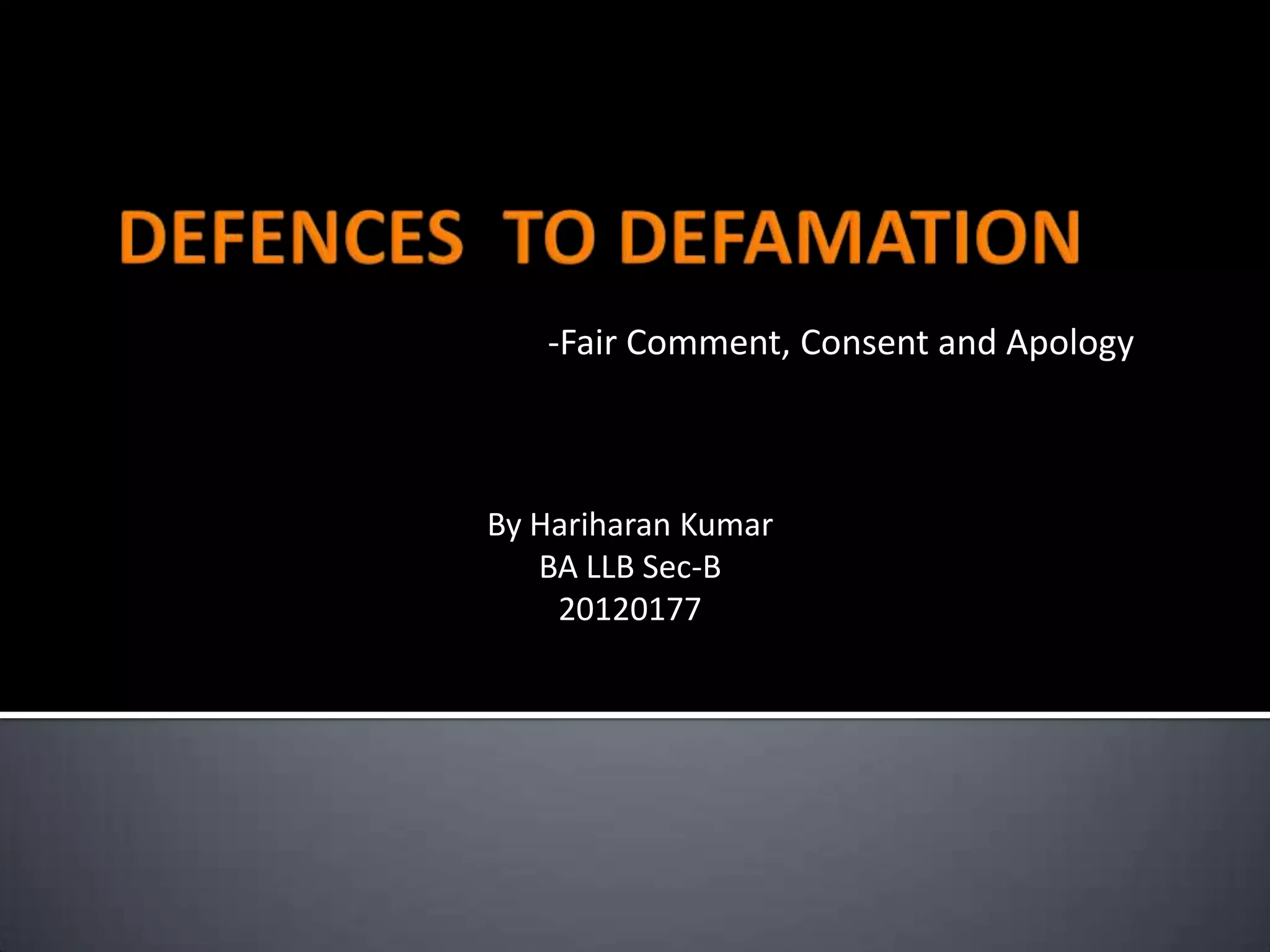 This document discusses defenses to defamation claims under Indian law, including fair comment, justification by truth, consent, and apology. It outlines the tests for determining what constitutes fair comment, including that the comment must be based on facts that are true or privileged. Consent and a valid apology accompanied by payment to the court can also serve as complete defenses to defamation.