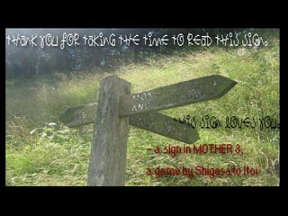 The designer used blues, reds, and blacks to create a mystical, surreal atmosphere that makes the logo unique. The shapes, including stars, yin-yangs, and eyes, are meant to seem unordinary. The quote from the game MOTHER 3 subverts expectations for what would be on a sign and provides a silly, heartwarming moment. The faded, old picture of the sign corresponds to the quote and game. The font comes from MOTHER 3 to connect thematically to its wacky humor. Font colors aid readability and the red quotation text reflects the red title screens of MOTHER games, though a homage to the games was not the initial intent.