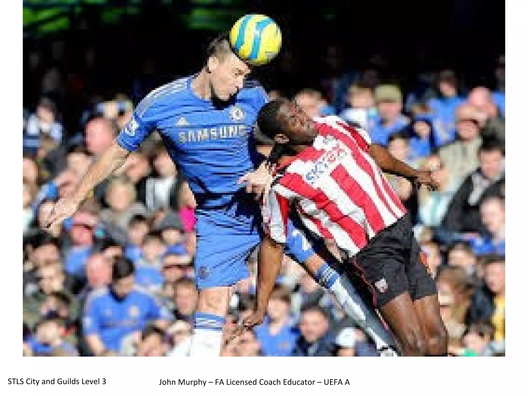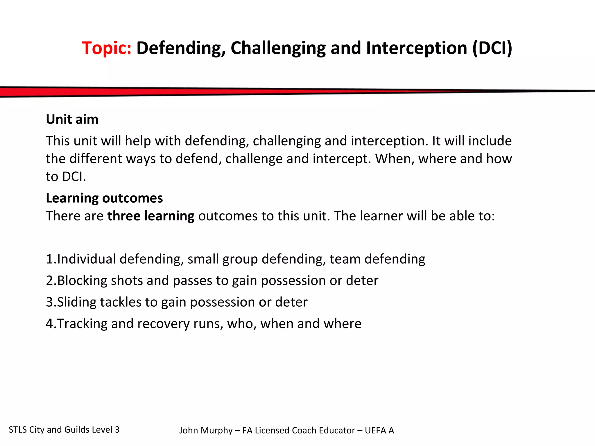 This unit covers defending, challenging, and interception (DCI) in soccer. The three learning outcomes are individual, small group and team defending; blocking shots and passes to gain possession; and sliding tackles to gain possession. Effective DCI requires making up ground as the ball travels, slowing down the attacker's first touch, preventing them from turning or passing forward, being patient and staying on your feet. When defending in pairs, the nearest player marks the ball while communicating with their partner about supporting distance, angles of support, and maintaining balance and cover.