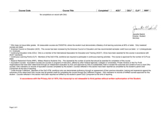 This document is an unofficial transcript for Angel B Nivar from the Defense Acquisition University (DAU) dated October 26, 2016. It shows that Mr. Nivar has completed several Continuous Learning Modules (CLMs) and Continuous Learning Courses (CLCs) from DAU since 2008 on topics like acquisition ethics, contracting officers representatives, and sustainable procurement. The transcript also notes that DAU does not issue letter grades and courses are recorded as pass/fail. It provides information about credit awarded for American Council on Education recommendations, Continuous Learning Points, and Reserve Retirement Points. No equivalent courses or credit through fulfillment are recorded for Mr. Nivar.