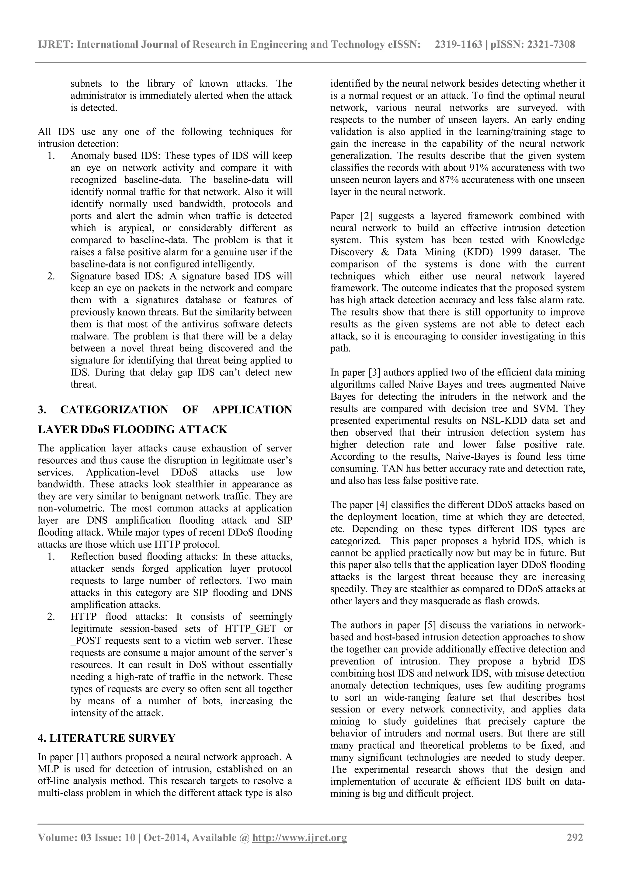 This document proposes a machine learning approach using the Naive Bayes algorithm to detect distributed denial of service (DDoS) attacks through network intrusion detection. It first discusses the issues with existing intrusion detection systems, including long training times and low accuracy. It then summarizes research on applying various machine learning techniques like neural networks, decision trees, and Naive Bayes to intrusion detection. The proposed system would build a classifier using Naive Bayes, which provides faster training than other methods, to distinguish normal and attack traffic. This approach aims to improve upon the training time and detection accuracy of existing intrusion detection systems.