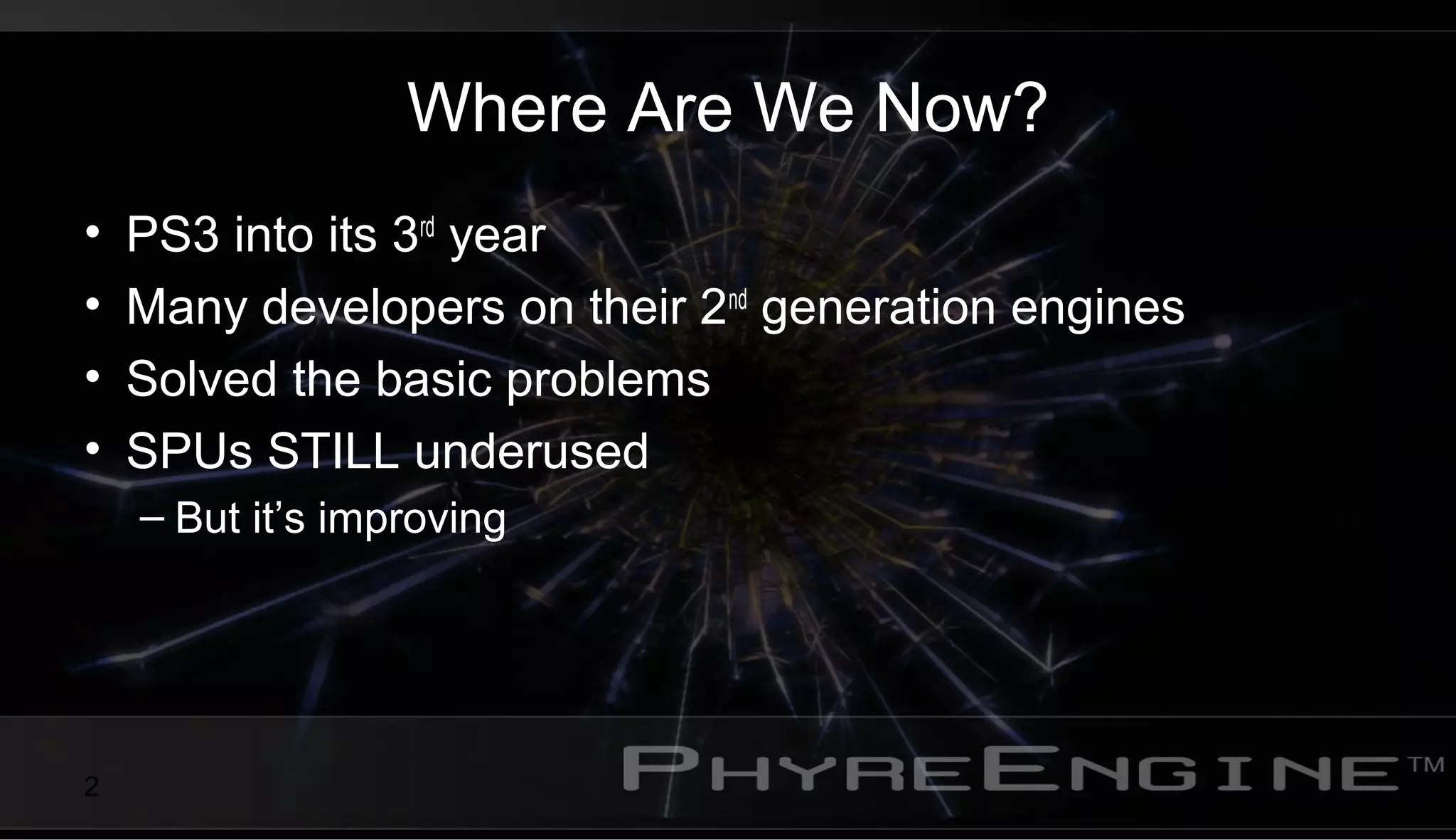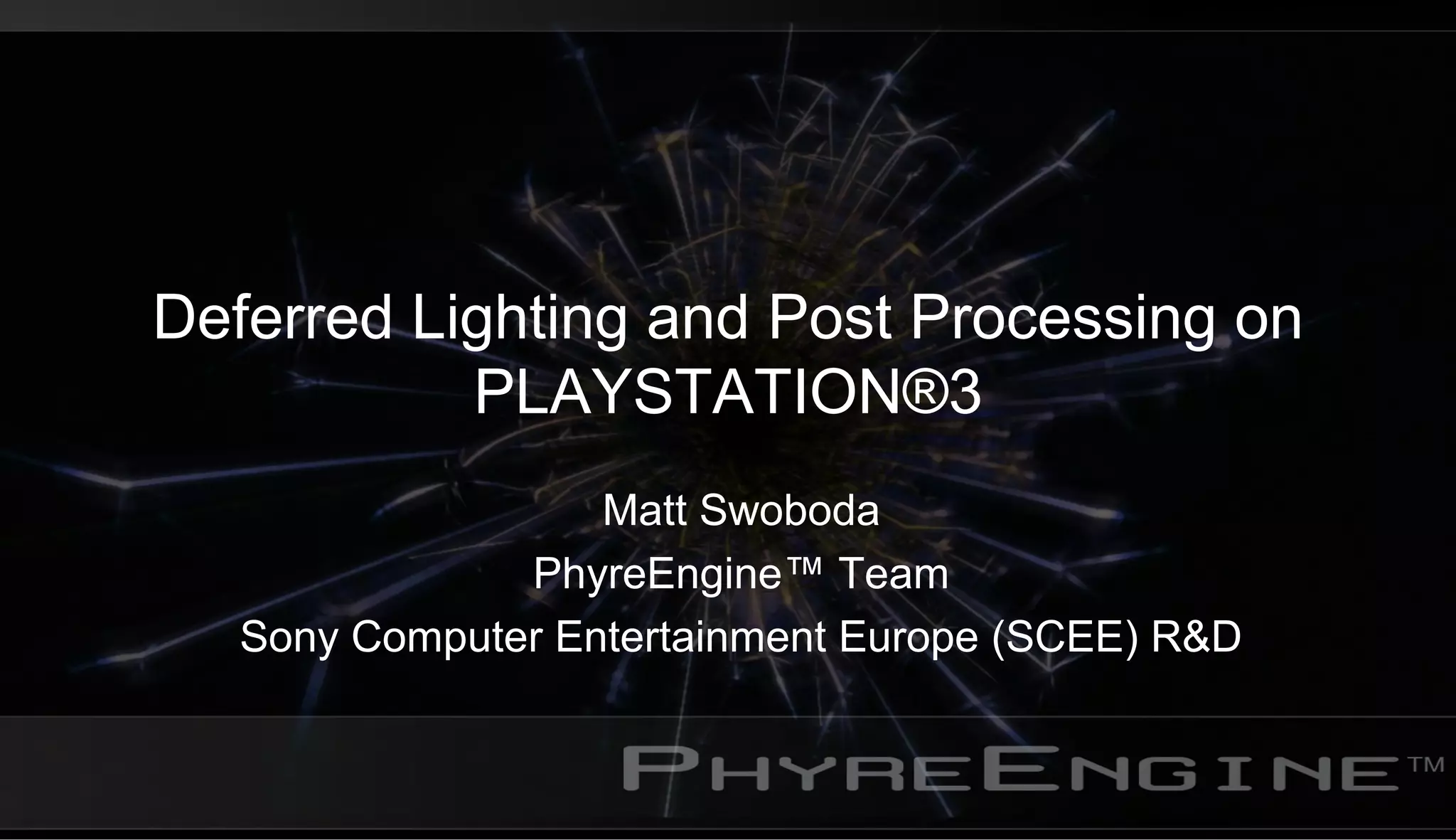 This document discusses optimizing post processing and deferred lighting on the PlayStation 3 by offloading work to the system processor units (SPUs). It provides examples of using the SPUs for depth of field preprocessing, screen space ambient occlusion, deferred lighting, volumetric lighting, and shadow mapping. The key advantages of using the SPUs include reducing GPU bottlenecking and improving performance by leveraging the SPUs' flexibility to optimize fragment processing through techniques like tile-based classification and caching shadow map tiles in local memory. Offloading post processing effects to the SPUs can significantly reduce frame times compared to performing the entire effect on the GPU.