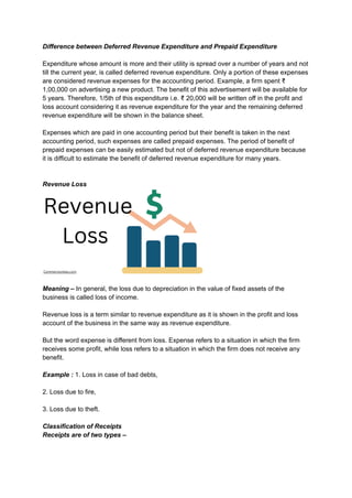 Deferred revenue expenditure refers to revenue expenditures that provide benefits over multiple years and are capitalized rather than expensed in the year incurred. It includes preliminary and advertisement expenses, with the remaining balance shown as miscellaneous expenditure on the balance sheet. Revenue receipts arise from normal business activities, while capital receipts are non-recurring and not from regular operations, with the distinction being in their treatment and classification in financial statements.