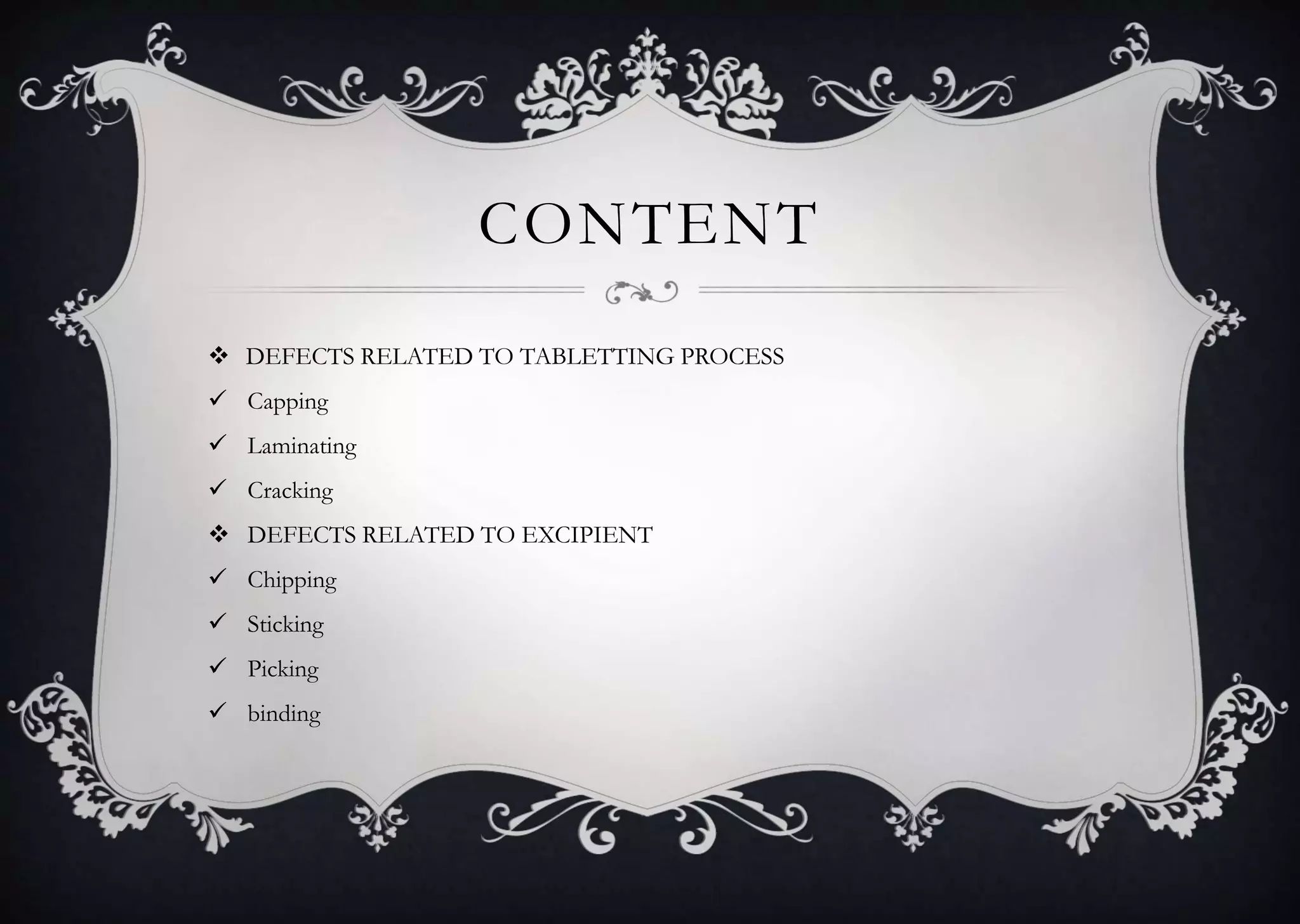 This document discusses various defects that can occur during the tableting process and their causes and remedies. It covers defects related to tableting, excipients, multiple factors, and the machine. Defects include capping, laminating, cracking, chipping, sticking, picking, binding, mottling, and double impressions. Causes can be related to formulation factors like moisture content, binder level, granule size, or machine factors like die and punch condition. Remedies involve modifying the formulation through changes to processing or composition, or adjusting machine settings and maintenance. The document provides detailed tables outlining specific causes and recommended remedies for different common defects.