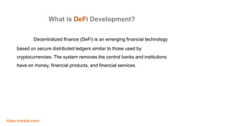 Decentralized finance (DeFi) development uses secure distributed ledgers to create financial systems independent of traditional banks, allowing for fee elimination and direct access to services via secure digital wallets. Key features include permissionless access, interoperability, transparency, and security through blockchain technology and smart contracts. RWaltz offers tailored DeFi solutions, ensuring global access and client collaboration for efficient asset management.