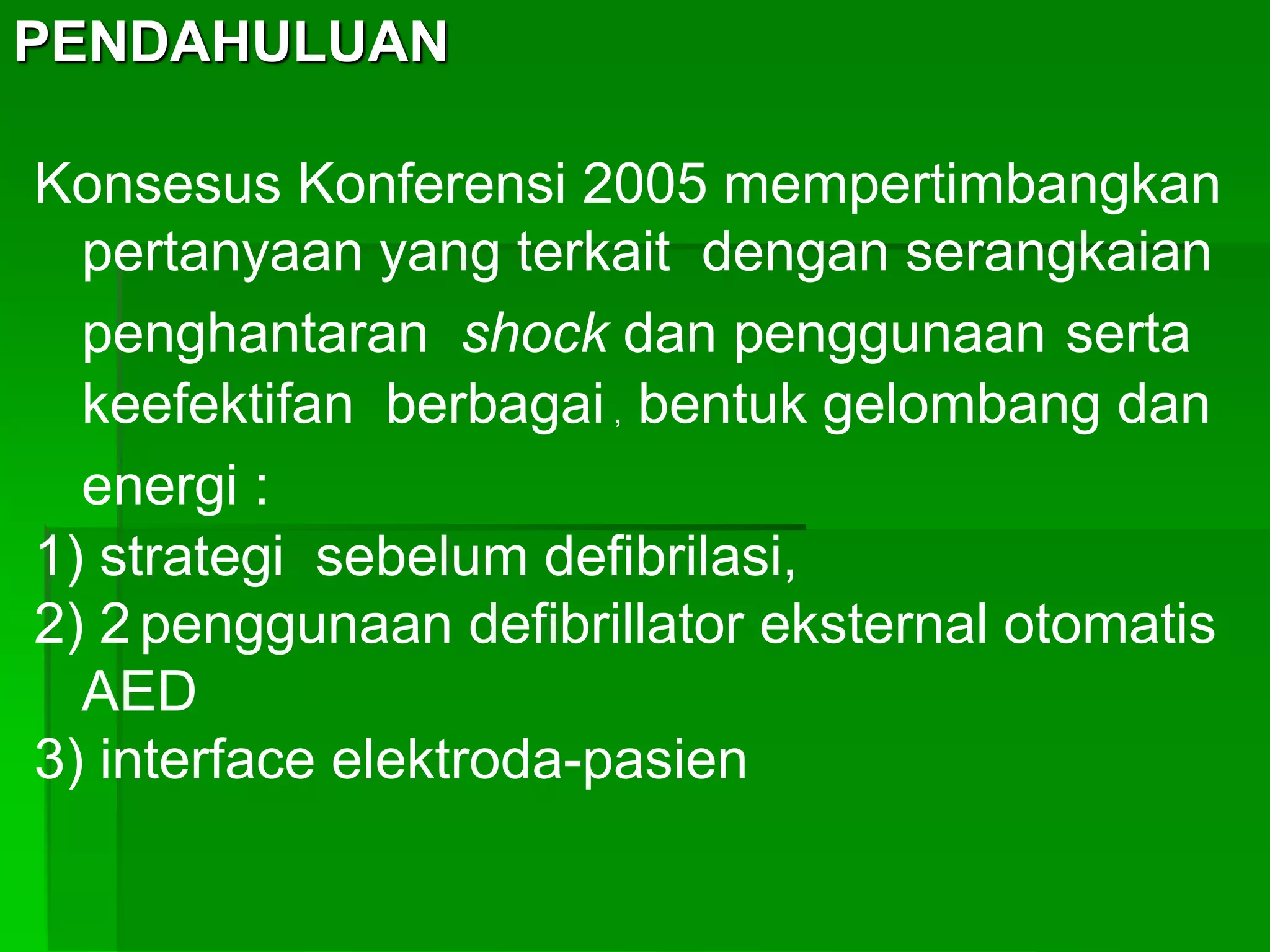 Konferensi 2005 membahas berbagai strategi defibrilasi seperti precordial thump, CPR sebelum defibrilasi, penggunaan AED, posisi elektroda, level energi shock, dan analisis bentuk gelombang. Tidak ditemukan level energi atau bentuk gelombang tertentu yang jelas lebih optimal, namun defibrilasi biphasic cenderung lebih efektif dalam terminasi VF dengan level energi yang sama atau lebih rendah dibandingkan monophasic.