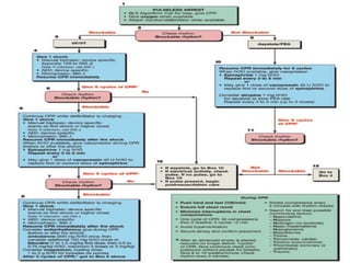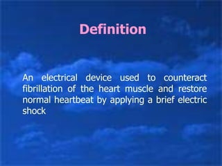 Defibrillators are electrical devices that deliver a shock to the heart to counteract fibrillation and restore a normal heartbeat. Early defibrillation is critical for survival from sudden cardiac arrest (SCA) as the chances of successful resuscitation decrease rapidly over time without treatment. For witnessed SCA, survival rates decrease 7-10% per minute without CPR. The three key actions that must occur within the first moments of SCA are activating emergency services, beginning CPR, and using an automated external defibrillator. For out-of-hospital witnessed arrests, rescuers should use the AED as soon as it is available without performing CPR first.
