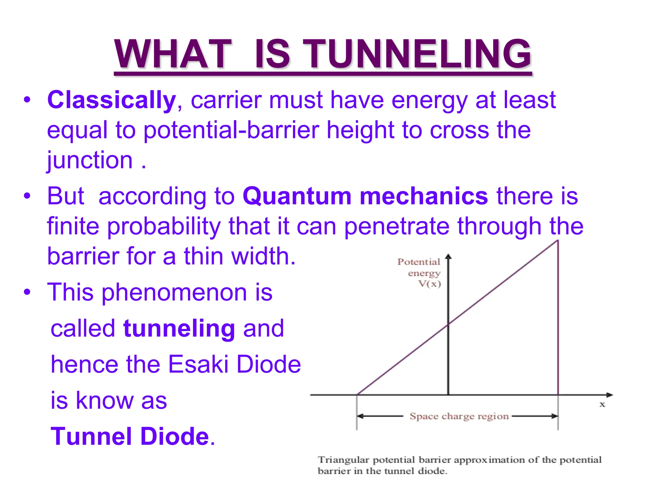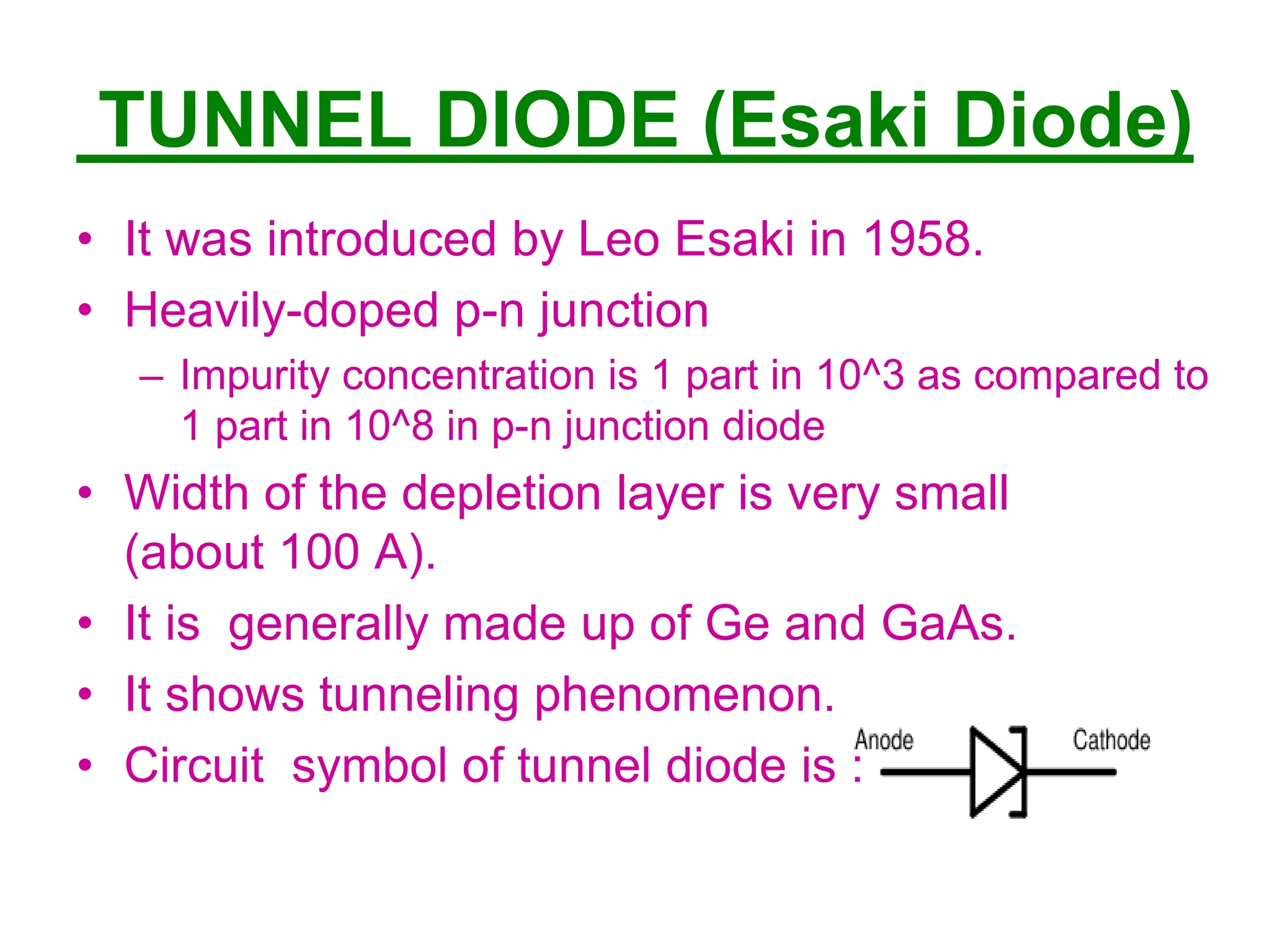The document summarizes the tunnel diode (Esaki diode), a heavily doped p-n junction diode that exhibits negative resistance. It was introduced in 1958 and shows quantum tunneling effects even at low voltages due to its extremely narrow depletion width of around 100 angstroms. The tunnel diode has an I-V characteristic curve with a peak current and valley current, producing a negative resistance region that can be modeled with an equivalent circuit of a junction capacitance in parallel with a negative resistance.