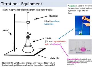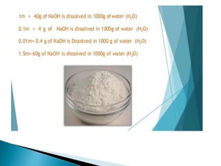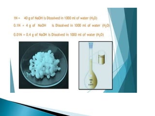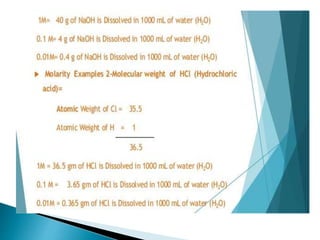 This document discusses various concepts related to pharmaceutical analysis including assay, analyte, titrant, titration, equivalence point, and standardization. It defines assay as a qualitative or quantitative assessment of an analyte using a titrant. Titration involves measuring the volume of titrant used to reach the equivalence point, as indicated by a color change from an indicator. The document also discusses different types of quantitative analysis techniques including volumetric (titrimetric), gravimetric, gasometric, and instrumental methods. It provides examples of concentration units used in pharmaceutical analysis such as molarity, molality, and normality.