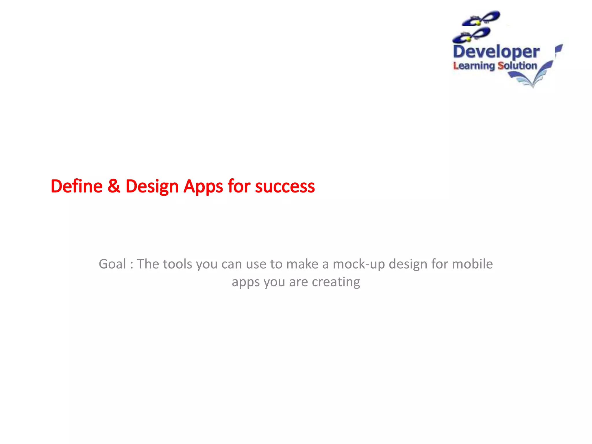 1. It discusses tools that can be used to create mock-up designs for mobile apps, such as paper, pen, and digital mock-up tools.