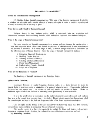 3. Key financial decisions include investments, financing, dividends, and liquidity. The optimal decisions maximize shareholder wealth.