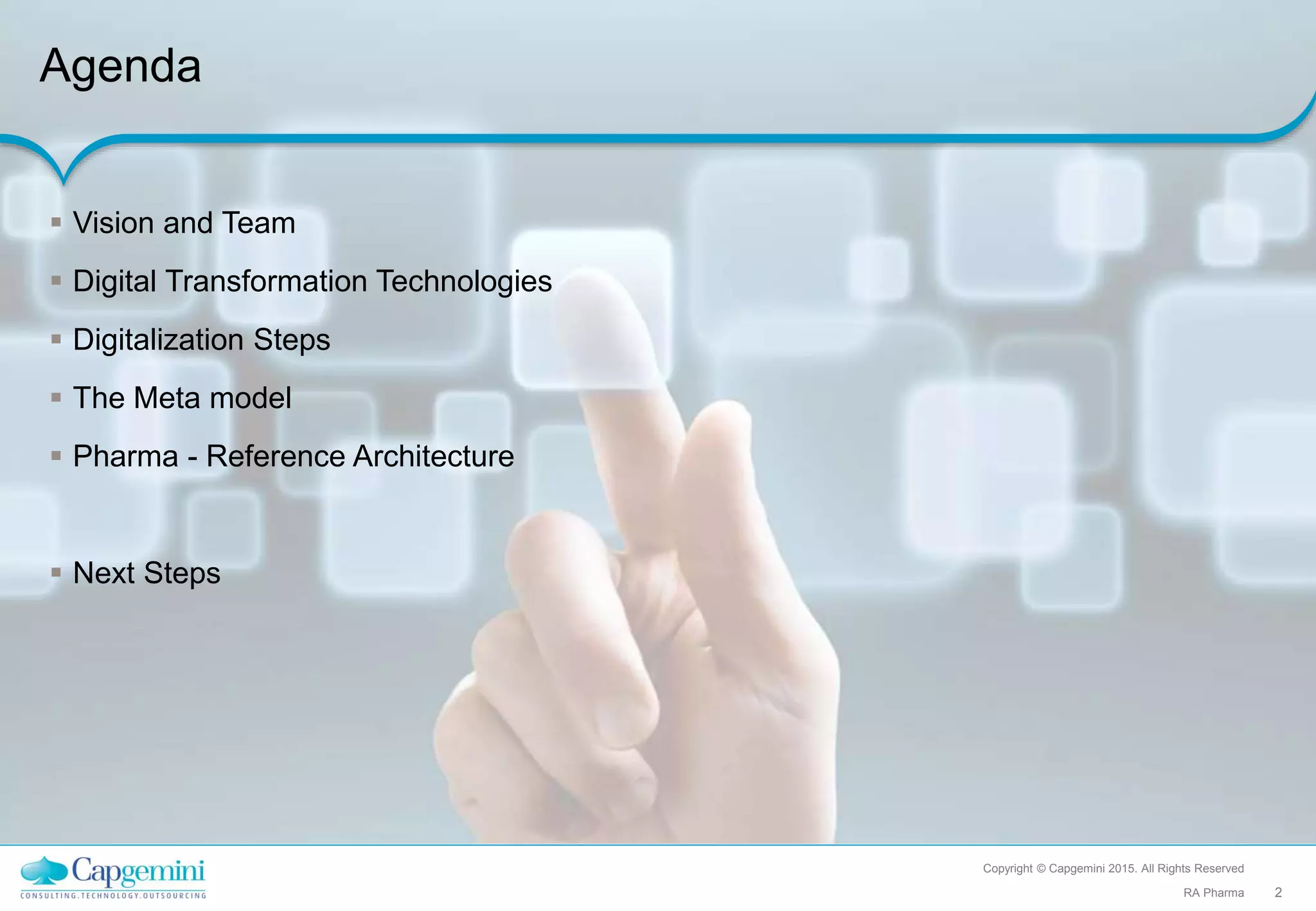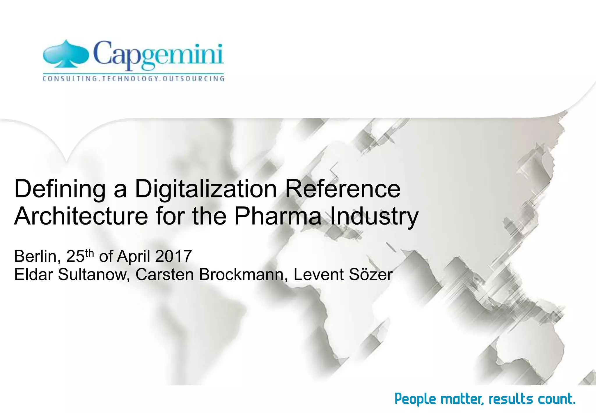 The document outlines a digitalization reference architecture for the pharmaceutical industry, focusing on technologies such as IoT, augmented reality, and cognitive computing. It aims to create transparency in technology usage, facilitate the integration of new IT suppliers, and enhance processes across drug development and patient care. The proposed architecture emphasizes synergies among various digital tools and offers a roadmap for implementing these technologies in the pharma sector.