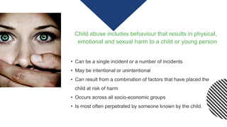 Child abuse can include physical, emotional, or sexual harm against a child. It can be a single incident or multiple incidents, and may be intentional or unintentional. Common forms of child abuse include emotional, physical, sexual abuse and neglect. Child abuse often results in emotional harm and can negatively impact a child's development, learning, emotions, behavior, and social interactions as well as family relationships and the community.